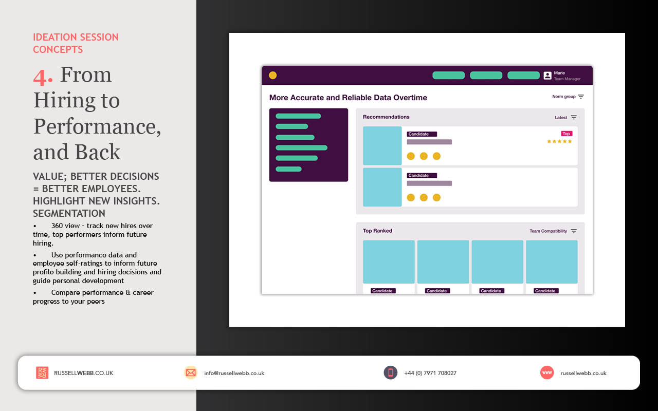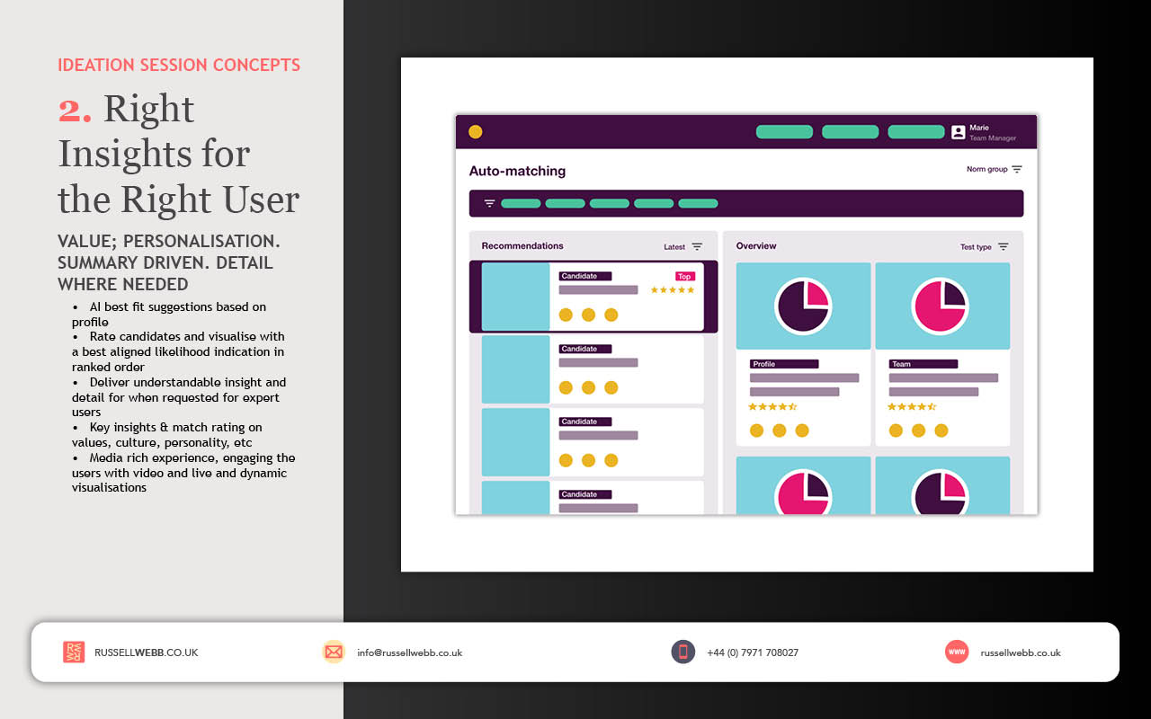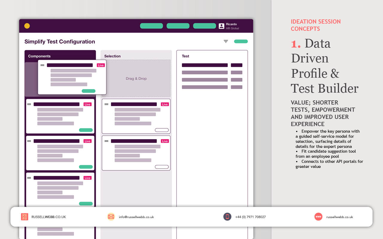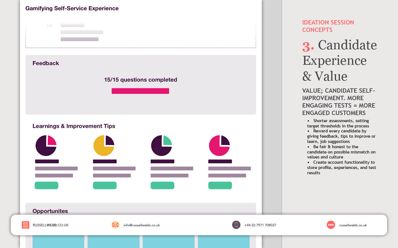 Client retention and configuring shorter tests, coupled with immediate feedback functionality all benefitting from a global database became the defining goals. Measuring success with increased number of service sign-ups and improving diversity all contributed to making a better hiring decision – one of our secondary workshop goals.